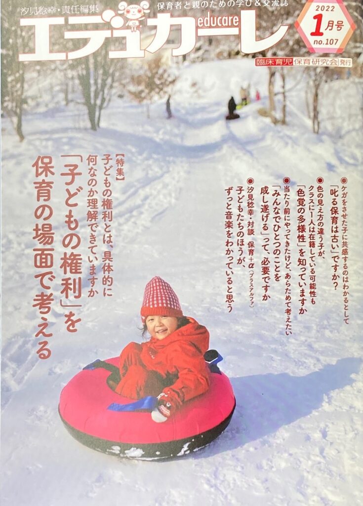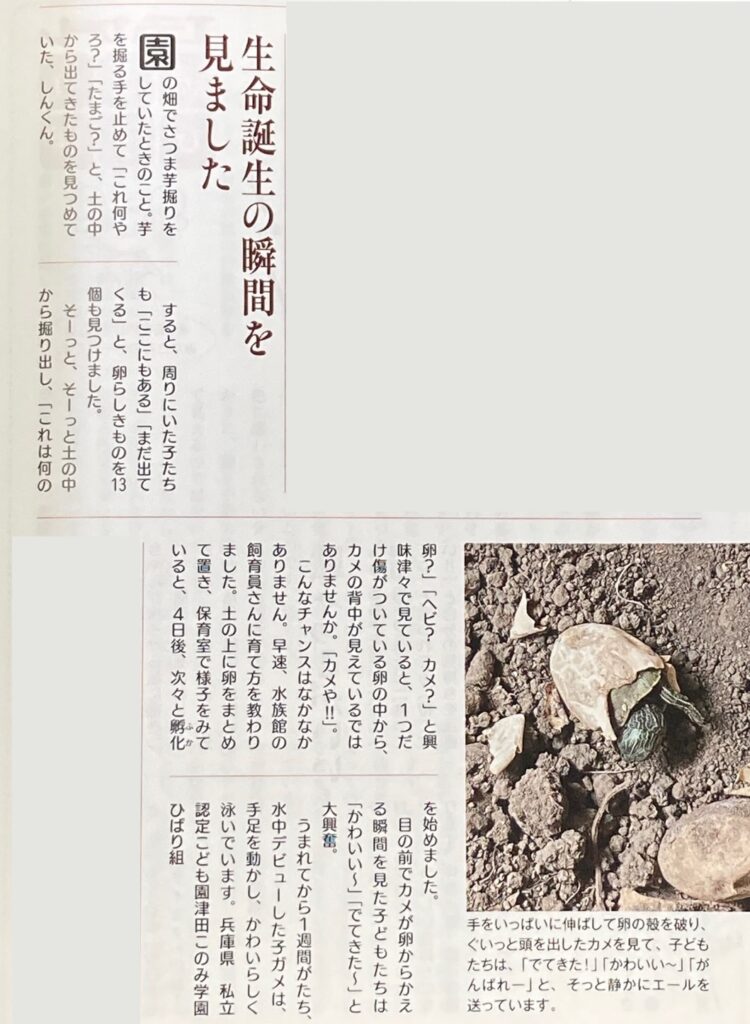 カメの孵化の投稿が採用され、エディカーレ(保育者と親のための学び&交流誌)という雑誌に、ひばりぐみの活動が掲載されました。