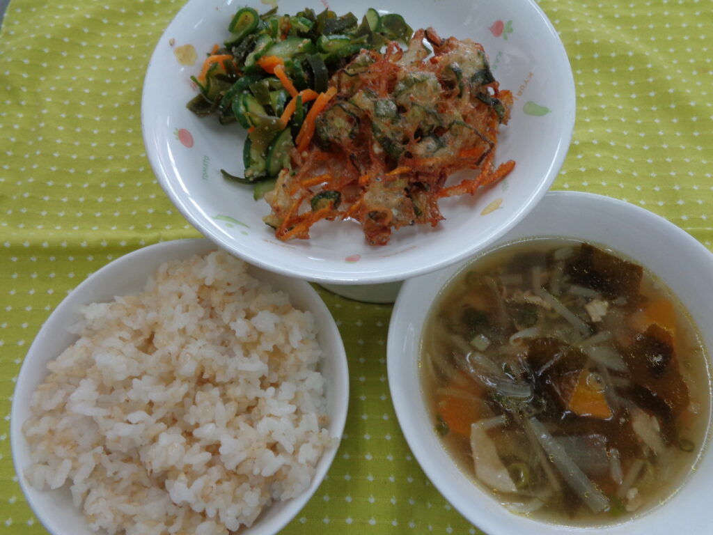 今日はどのメニューも野菜がたくさんとれる献立になっています。野菜のかき揚げは、オクラ、玉ねぎ、にんじんとしらす干しを米粉と片栗粉を水で溶いたものに混ぜ醤油と塩で味を調えて材料を混ぜ1つずつ形を作り揚げています。