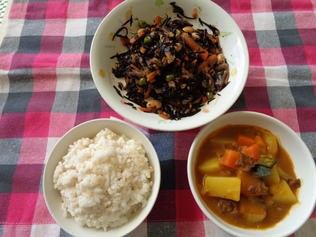 カレーシチューは子ども達に人気のメニューなのでいつもよく食べてくれています。今日は、園の畑で育てている大根の葉がたくさんとれたのでごま油と醤油で炒めて以上児さんのクラスに提供しています。