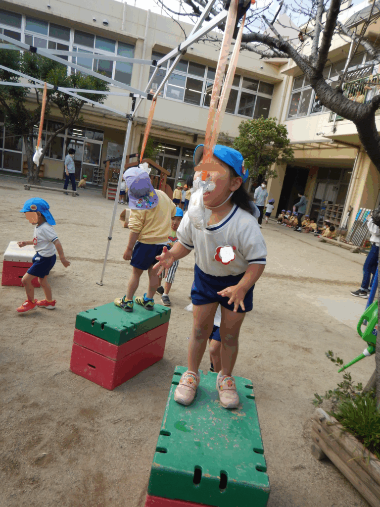 コースの最後に手洗い消毒があり、そしてパンくい競争!