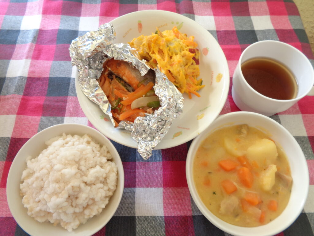鮭のホイル焼きはちゃんちゃん焼き風にみそ味で仕上げました。子ども達は美味しいと給食室にまで言いに来てくれました☆