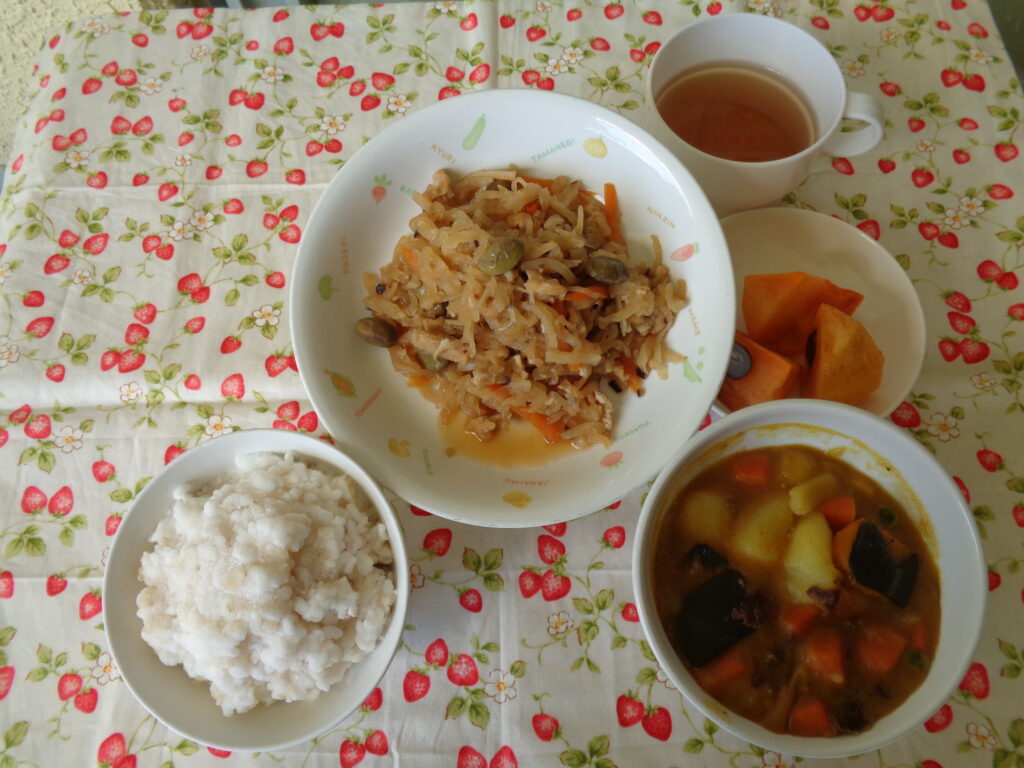 今日は、給食に園の畑でとれた柿を提供しています。甘くて食べやすかったようでよく食べてくれていました。カレーや切干大根の煮物もよく提供するメニューなので子ども達もしっかりと食べてくれています。