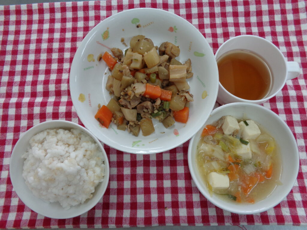 筑前煮は、れんこん、ゴボウ、ニンジン、大根、さやいんげん、干し椎茸、鶏肉が入っていてたくさん野菜のとれるメニューになっています。食材がたくさんなので量もたくさんできましたがどのクラスの子ども達もしっかりと食べてくれていました。