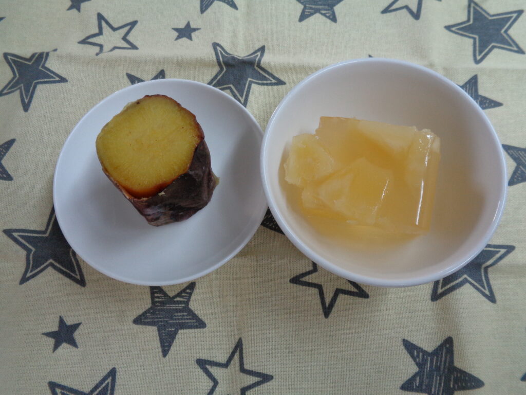 今日は、園庭で焼き芋をしておやつに出しました。職員が火を起こして炭を作り焼き芋の準備ができたところで、年長児にホイルで包んだ芋を入れてもらい、焼きあがるまでは、火が消えないように枝を足したり手で仰いだり子ども達も楽しそうに過ごしていました。焼きたての芋をすぐに分けておやつに食べてもらいました。美味しそうに食べる姿も見れてよかったです。
