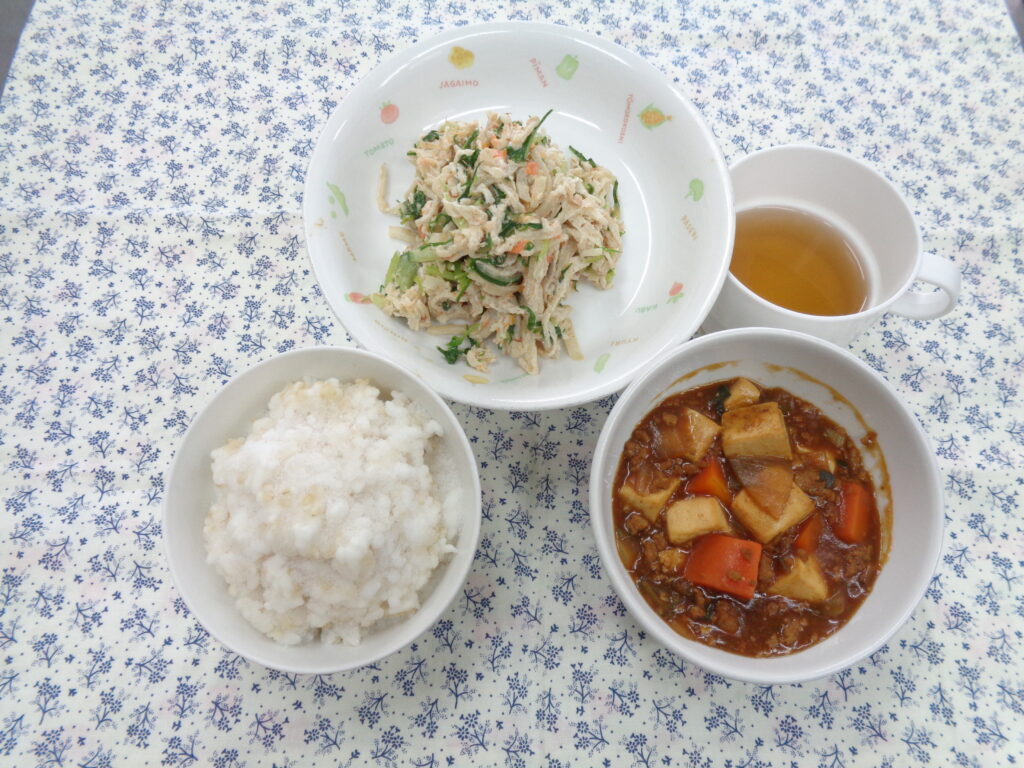 麻婆豆腐は、給食でもよく提供し子ども達もよく食べてくれるメニューです。サラダは、マヨネーズで味付けをしているので子ども達にも食べやすい仕上がりになっています。今日もどのクラスもしっかりと食べてくれていました。