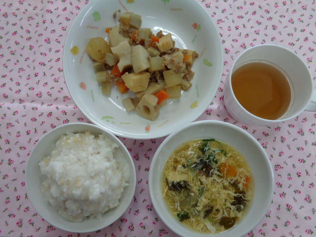 今日の根菜のそぼろ煮は新メニューでした。にんじん、ごぼう、大根、たけのこ、れんこんの五種類の根菜を使用しています。炒めたミンチに根菜を入れだし汁と調味料で味を調えてしっかり煮込んでいます。子ども達も「おいしかったよ。」「たくさん食べた。」と笑顔で声をかけてくれました。