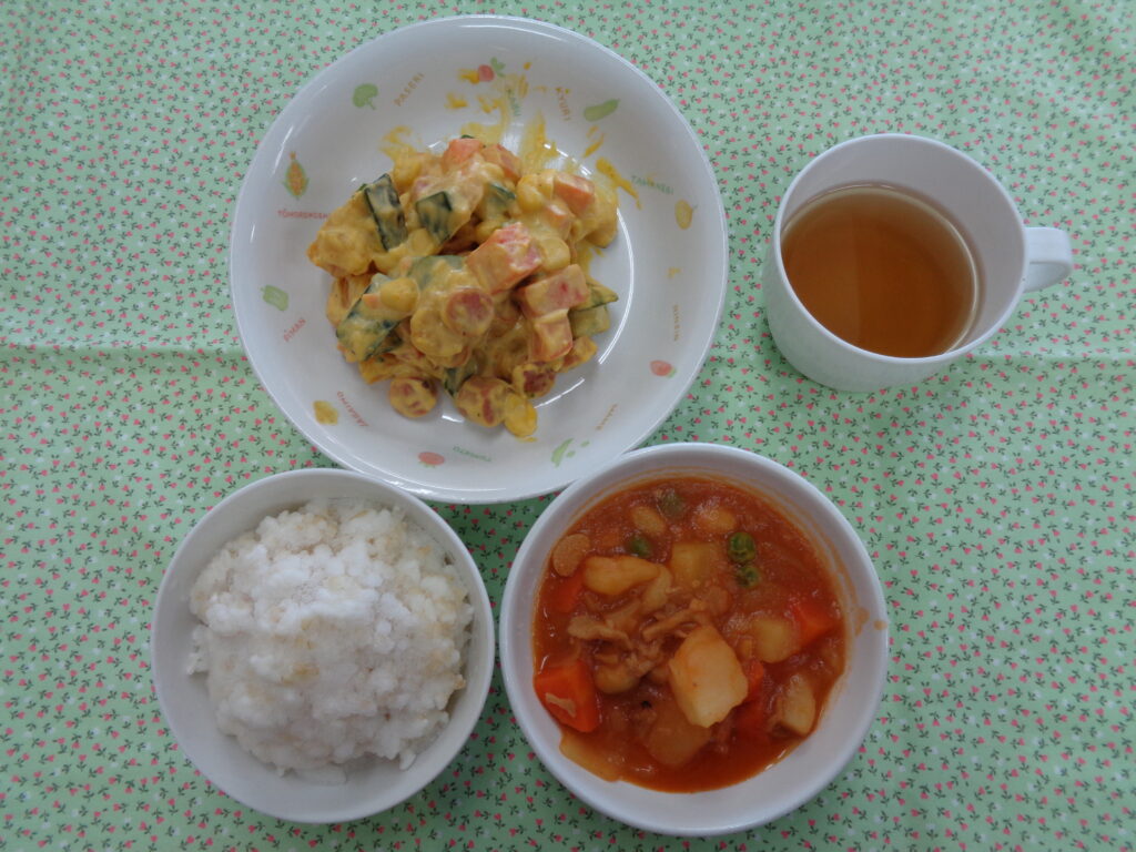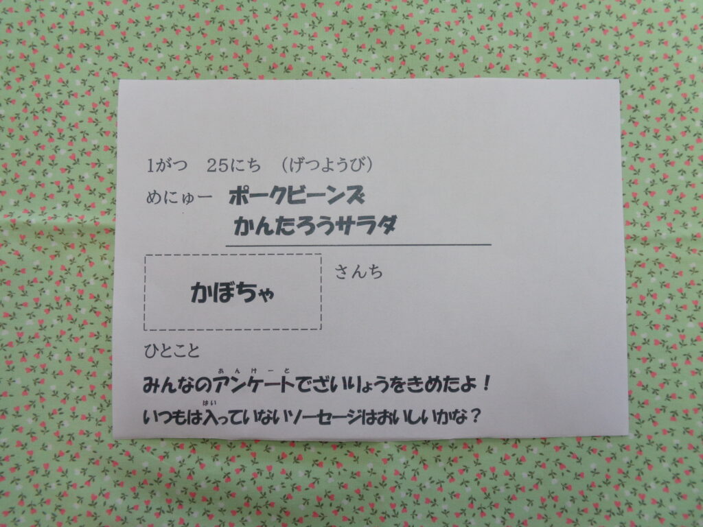 かんたろうサラダは、子ども達からサラダに入れたい食べ物のアンケートをとり票の多かった、にんじん、カボチャ、きゅうり、ソーセージ、コーンを使用して作りました。味付けは、マヨネーズと豆乳ヨーグルトを使い塩で味を調えています。