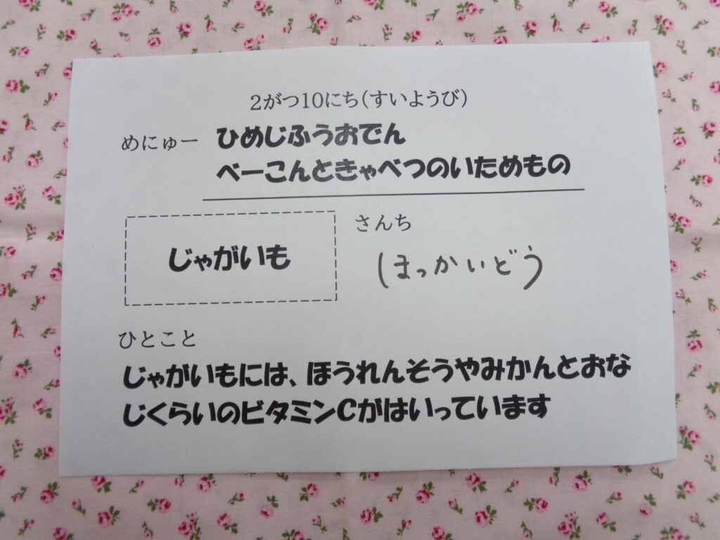 今日の、姫路風おでんは牛肉、ひら天、にんじん、こんにゃく、じゃがいも、だいこんのたくさんの具材をだし、さとう、しょうゆ、生姜で味を調えて煮込んでいます。今回もたくさん出来ましたが子ども達もよく食べてくれていて残食もほとんどなかったのでとても嬉しかったです。