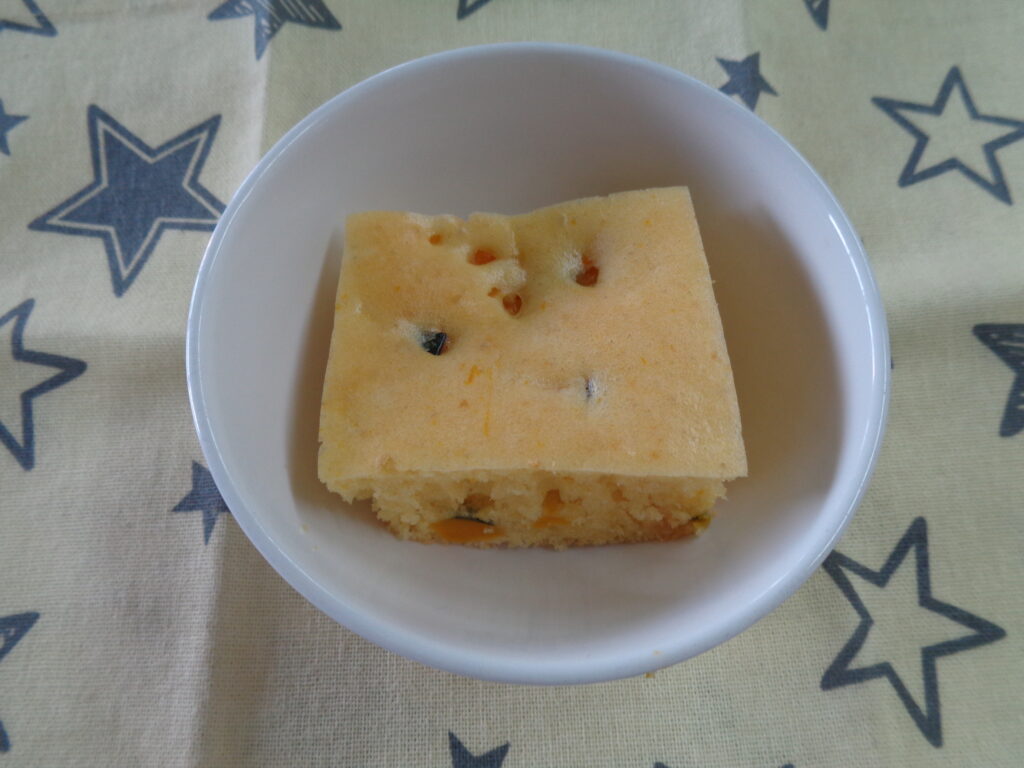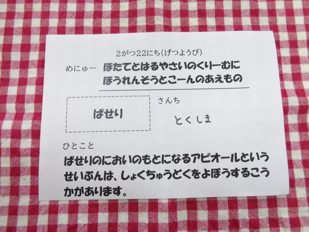 ホタテと春野菜のクリーム煮は旬の菜の花を使っています。じゃがいも、にんじん、たまねぎ、パセリ、ホタテとほかの食材もたくさん入っています。豆乳とシチューのルゥを使いしっかりと煮込みました。和え物は、ほうれん草、コーン、にんじんが入ることで彩りがよく仕上がっています。