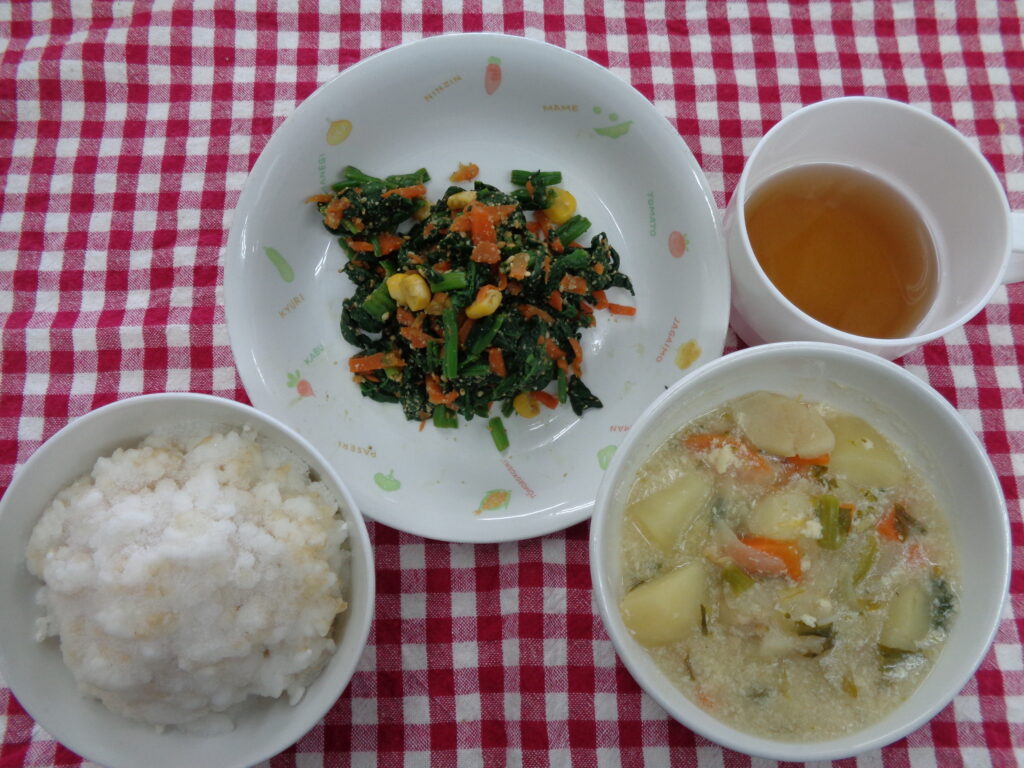 ホタテと春野菜のクリーム煮は旬の菜の花を使っています。じゃがいも、にんじん、たまねぎ、パセリ、ホタテとほかの食材もたくさん入っています。豆乳とシチューのルゥを使いしっかりと煮込みました。和え物は、ほうれん草、コーン、にんじんが入ることで彩りがよく仕上がっています。