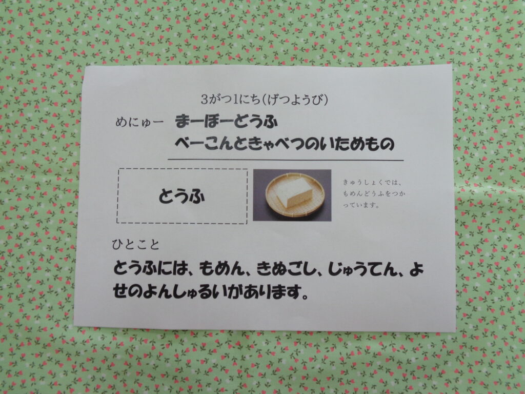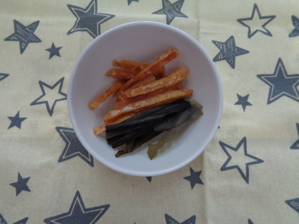 今日の献立は、給食でもよく出るメニューで子ども達もしっかりと食べてくれています。おやつは、しっかりと噛む力をつけてもらうためにかみかみおやつとして今日は、芋けんぴととろべーを出しています。