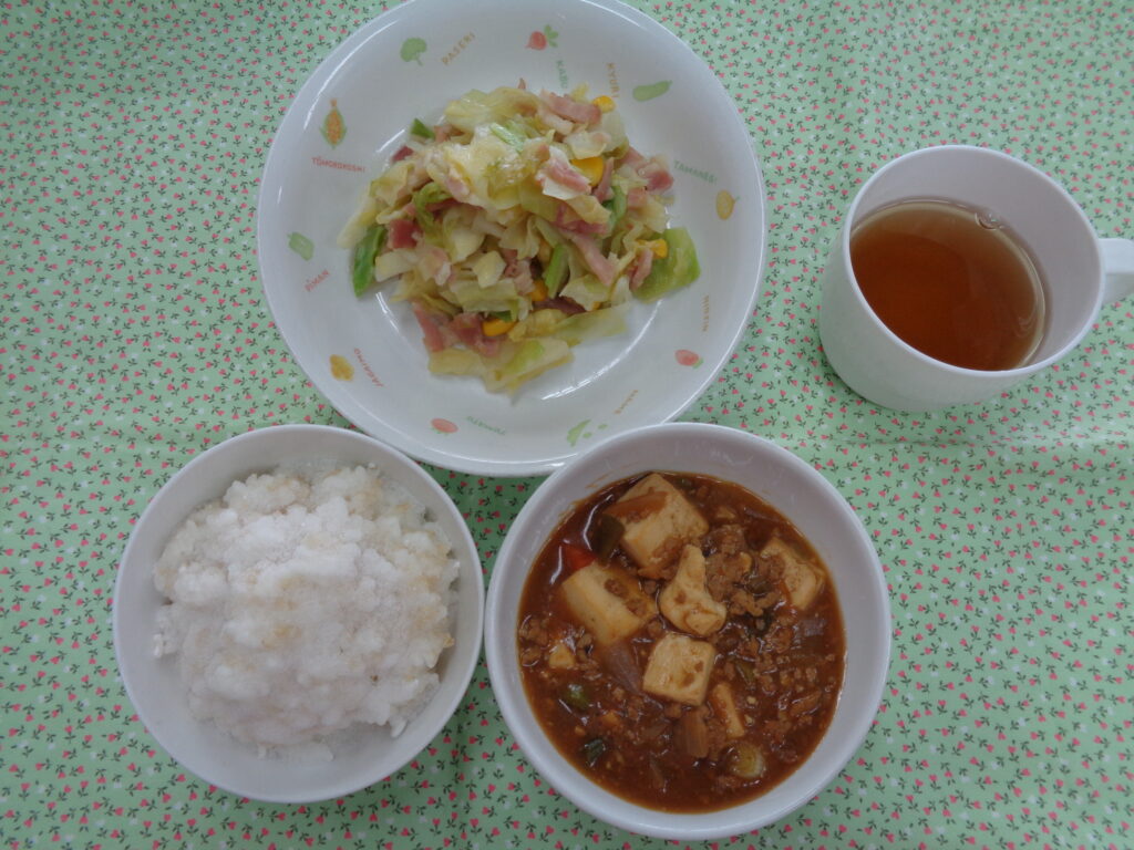 今日の献立は、給食でもよく出るメニューで子ども達もしっかりと食べてくれています。おやつは、しっかりと噛む力をつけてもらうためにかみかみおやつとして今日は、芋けんぴととろべーを出しています。
