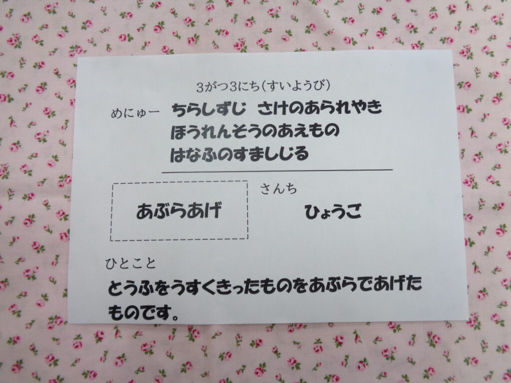 今日はひな祭りメニューになっています。ご飯はちらし寿司、カラフルなあられを乗せて焼いた鮭や花麩の入ったすまし汁で見た目も楽しめるひな祭りならではのメニューになっています。おやつのゼリーも抹茶、ヨーグルト、いちごで三色にしました。子ども達が喜んでもらえるように給食室で考えたので喜んでもらえ