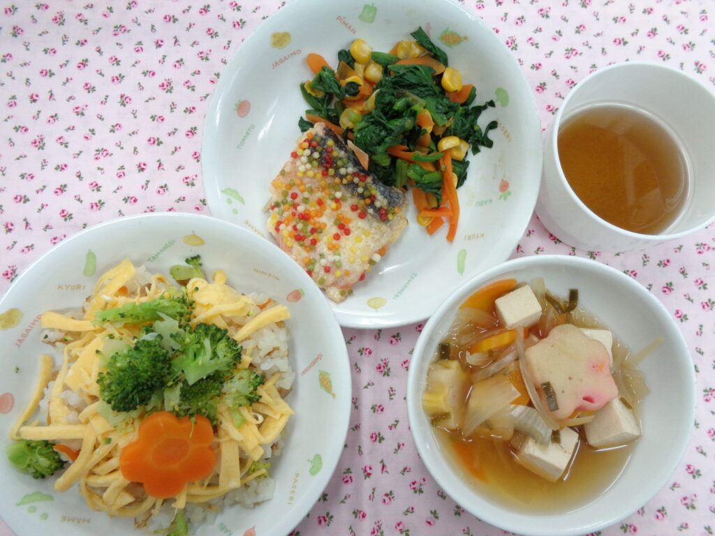 今日はひな祭りメニューになっています。ご飯はちらし寿司、カラフルなあられを乗せて焼いた鮭や花麩の入ったすまし汁で見た目も楽しめるひな祭りならではのメニューになっています。おやつのゼリーも抹茶、ヨーグルト、いちごで三色にしました。子ども達が喜んでもらえるように給食室で考えたので喜んでもらえ