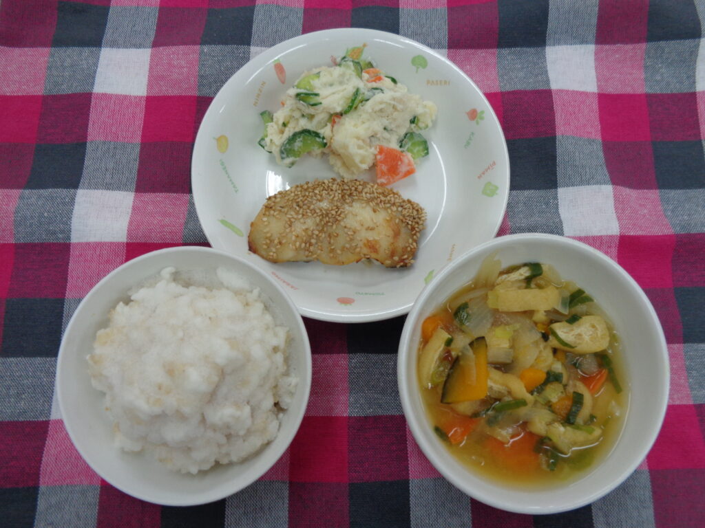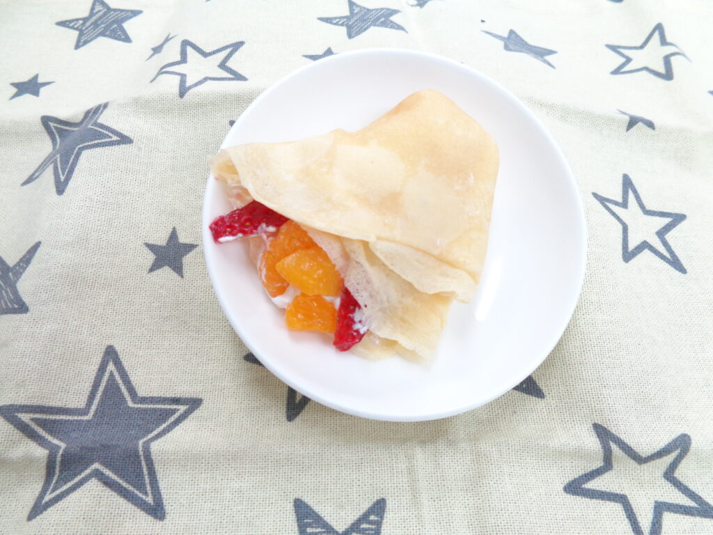 今日のポテトサラダには、じゃがいも、にんじん、きゅうり、鶏ささみが入っていました。マヨネーズで味付けしているので子ども達にも食べやすく仕上がっています。おやつには、少し早めのホワイトデーということでクレープを出しています。生クリーム、もも、みかん、いちごをクレープの生地で1つ1つ包んでいます。子ども達も喜んでくれていたようで良かったです。
