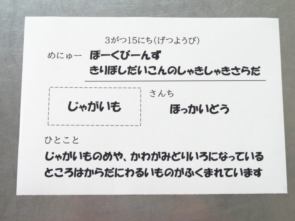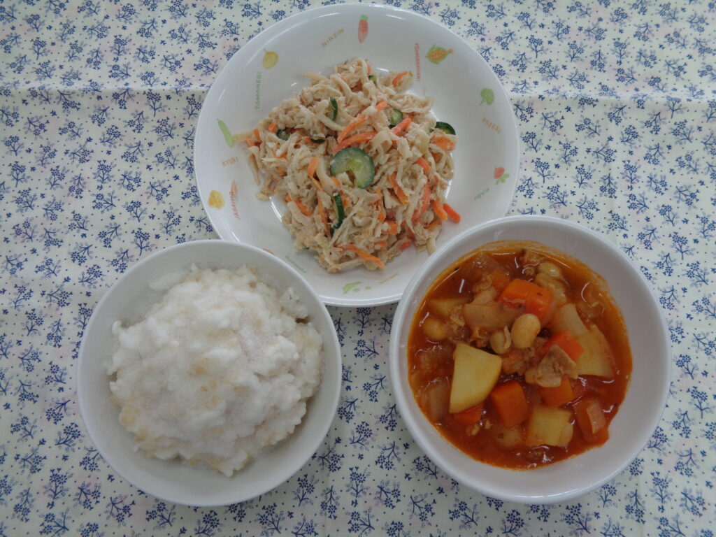 ポークビーンズは、豚肉、大豆、じゃがいも、にんじん、玉ねぎ、トマトピューレなどの食材を使っているので具だくさんになっていますが、子ども達はよく食べてくれています。サラダは、切干大根を使うことで噛み応えのあるサラダになっています。よく噛んで食べることで噛む力もつきます。