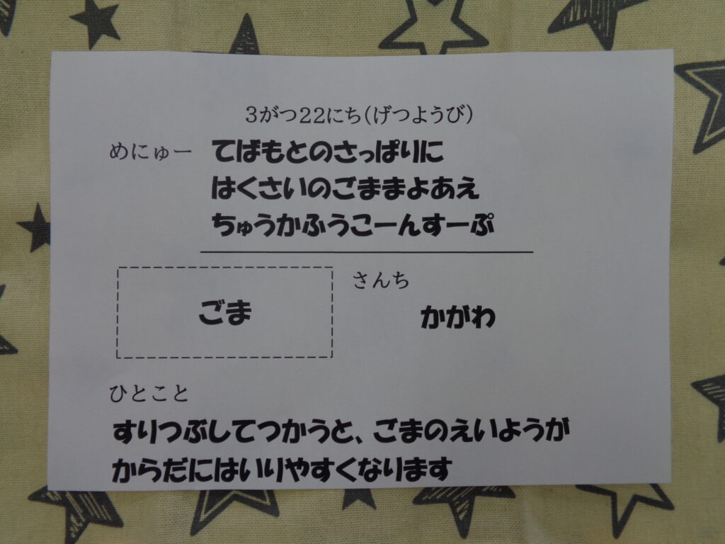 中華風コーンスープは豆乳やコーンクリームを使ったコーンスープに卵を加えることによって中華風に仕上げています。卵が加わることで食感が変わるので苦手な子ども達もいたのか少し残食もありました。子ども達にも食べやすくなるように工夫しながら調理したいと思います。