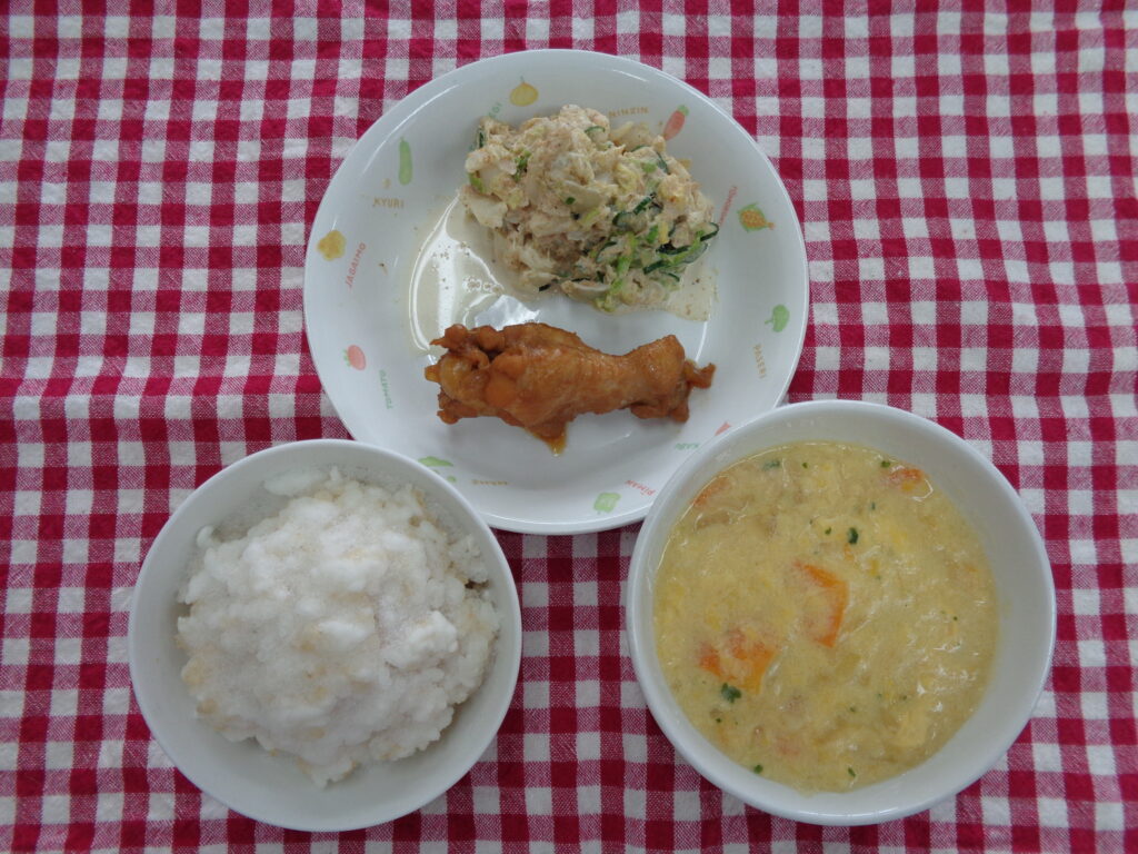 中華風コーンスープは豆乳やコーンクリームを使ったコーンスープに卵を加えることによって中華風に仕上げています。卵が加わることで食感が変わるので苦手な子ども達もいたのか少し残食もありました。子ども達にも食べやすくなるように工夫しながら調理したいと思います。