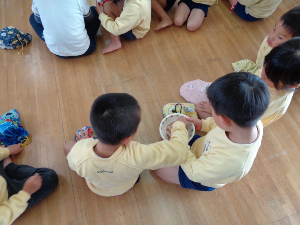 今日は、そのお米についての話をおやつの時間に年長児にしました。手作り人形「おこめくん」を使って、子ども達にもわかりやすいようお話しをし、実際に籾のついた米、玄米、白米を触って、匂いを嗅いでもらい、普段食べているごはんがどんなものなのか見てもらいました。子ども達からは、「白いお米に比べて茶色いお米は硬い!」や「ホットケーキの匂いする~」などたくさんの声が聞こえてきました。