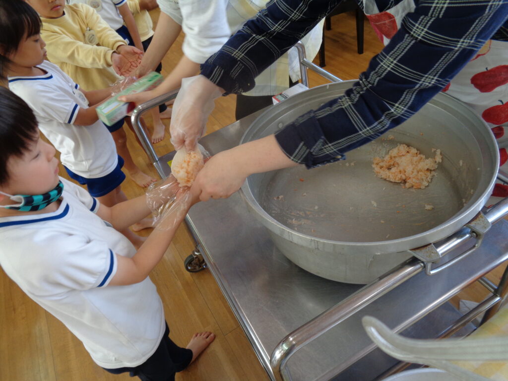 今日のおやつは「鮭おにぎり」。そこで、年長児のみんなには自分たちでおにぎりを作ってもらいました。お家で作ったことがある子が多く、上手に握っていました。握る前の形を「お船の形!」と見せてくれたり、「丸く握れた!」など楽しそうに作っていて嬉しくなりました。ほとんどの子がおかわりをしてくれ、普段の給食をあまり食べない子もおかわりしてくれました。たくさん炊いていたご飯もきれいになくなり、もっと食べたいという声も聞こえてきました。