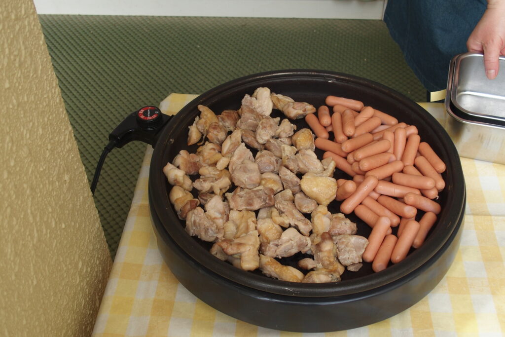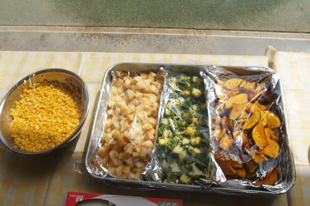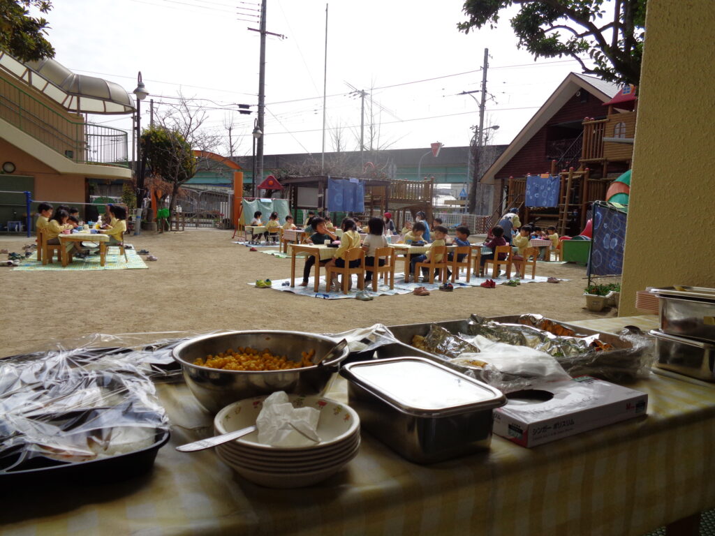 3~5歳児を対象に園庭でカレー屋さんをしました。カレーのトッピングにブロッコリー・コーン・ポテト・かぼちゃ・ソーセージ・鶏肉を用意しました。子どもたちが好きなものを選び、自分だけのカレーを作っていました。子ども達もとても喜んでいてくれて、いつもはおかわりしない子もおかわりに来てくれるくらい人気でした。「おいしかった!」「かぼちゃが甘ーい」と感想を伝えに来てくれる子もいました。新型コロナウイルスの影響で以前のように子ども達のためにできることが少なかったため、今回カレー屋さんを実施することができ本当に良かったです。子ども達のかわいい笑顔をたくさん見ることができてとても嬉しく思います。