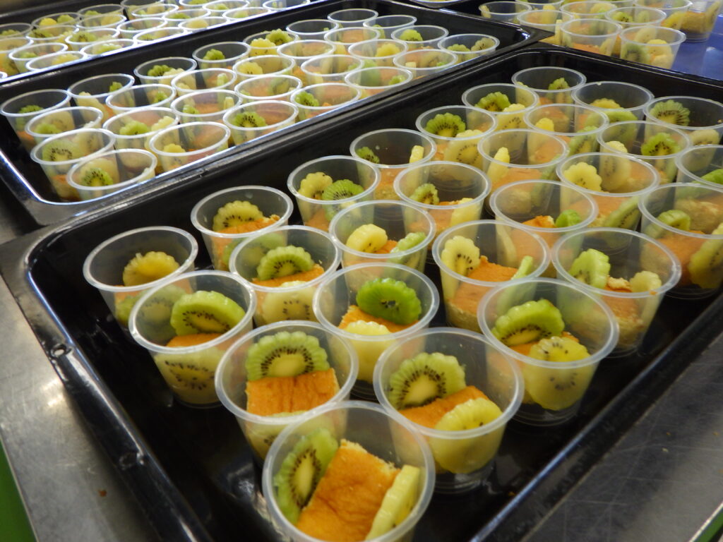8月4日の”栄養の日”の活動でキウイと野菜ジュースを頂きました。そのキウイを使って、今日のおやつは「キウイのトライフル」を作りました。見た目もかわいく子ども達も喜んでくれたおやつです。作業工程は少し多いですが、市販のものを使ったりすると簡単にできるのでご家庭でも試してみてください(^^♪