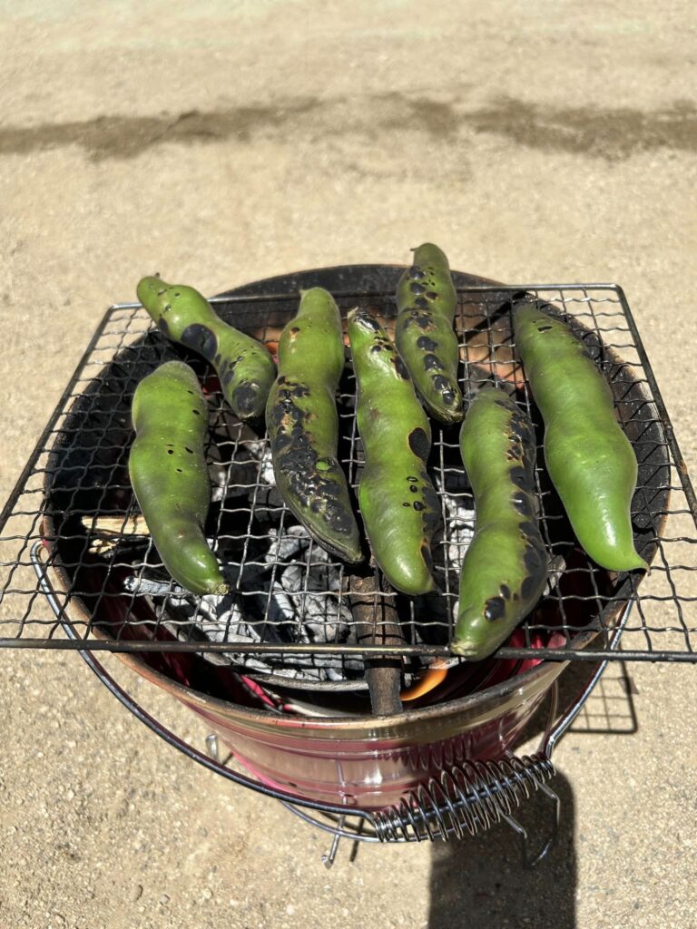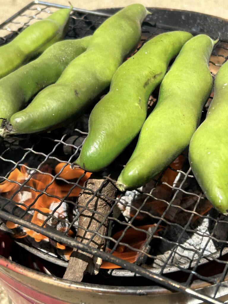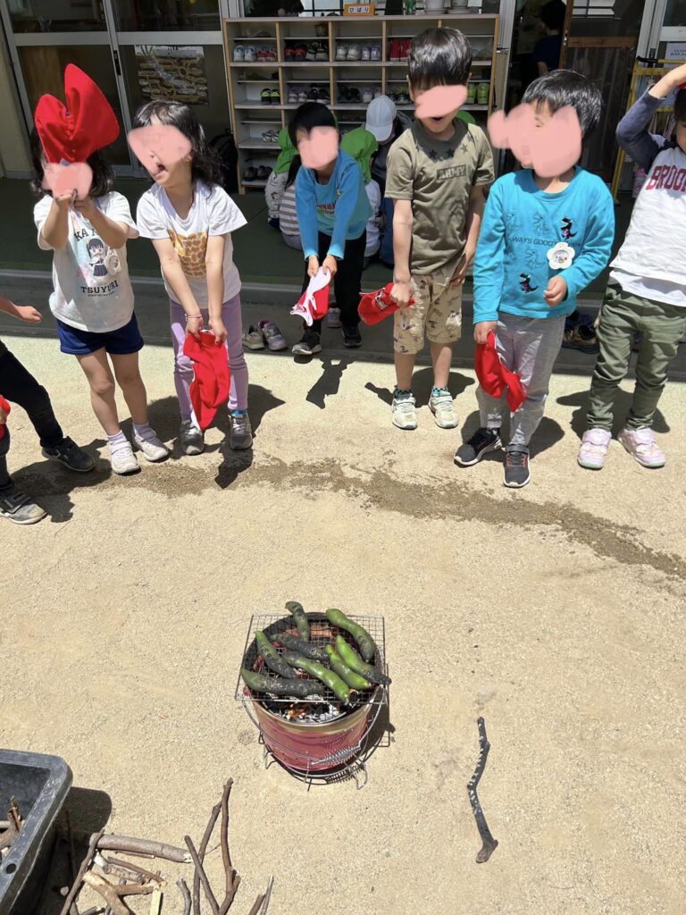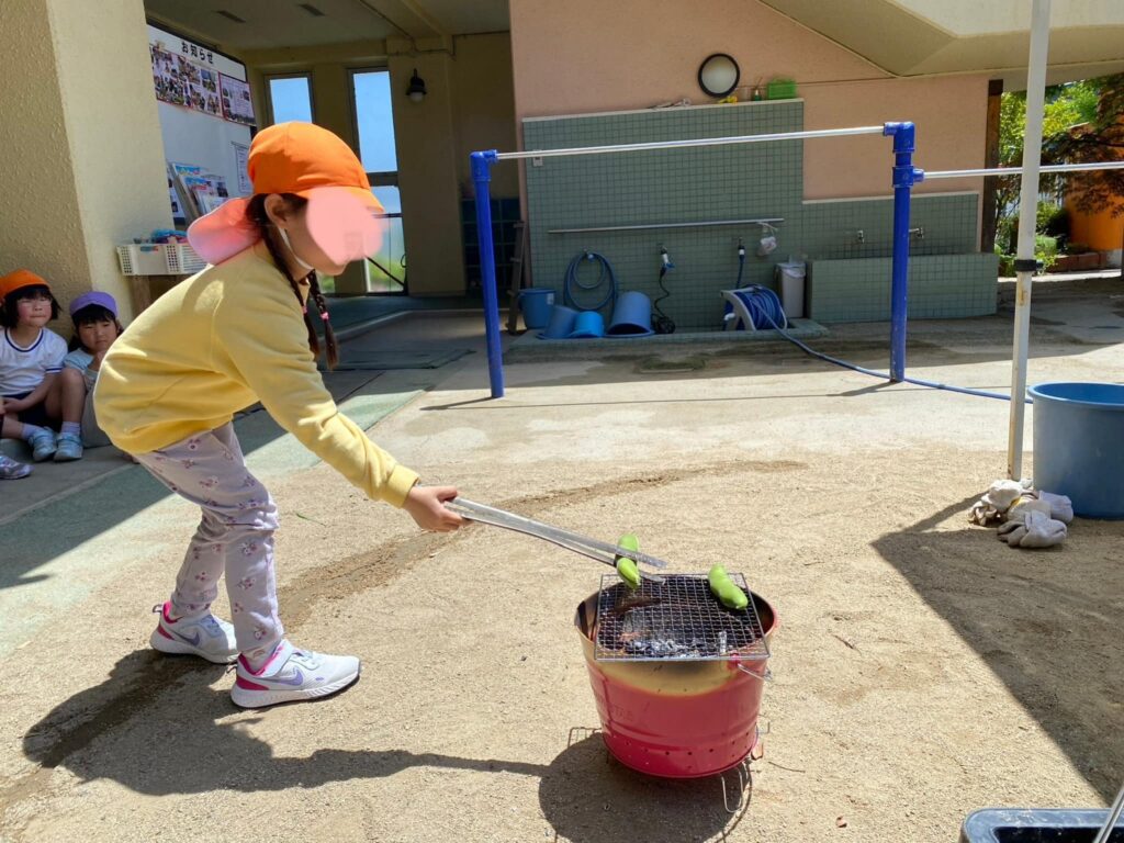 鞘のまま、焼いたら美味しいんじゃない?ということになり、さっそく園庭で小さな火を起こしました。